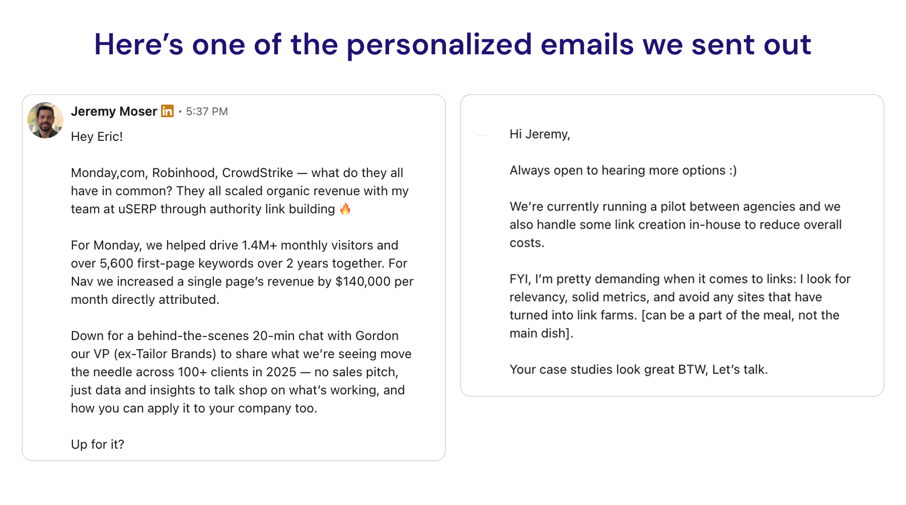 Let’s look at a real example. When monday.com reached out to my company, uSERP, they had 100+ internal SEO staff but still needed help with content production and PR.