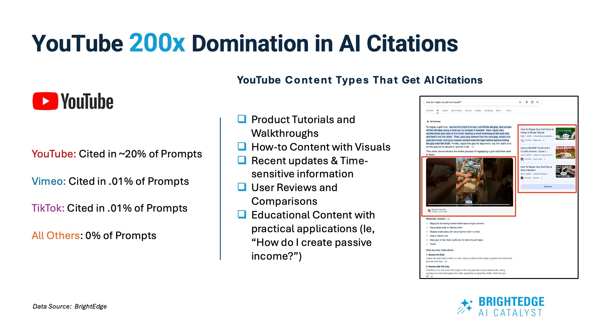 Text-based search is no longer the sole player. Multimodal search – combining text, voice, image, and video – is becoming standard practice. BrightEdge data shows a 121% increase in ecommerce-related YouTube citations for AI Overviews.