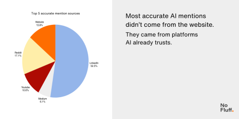 - 6% citation accuracy, ~11% pointing to the brand’s own site.