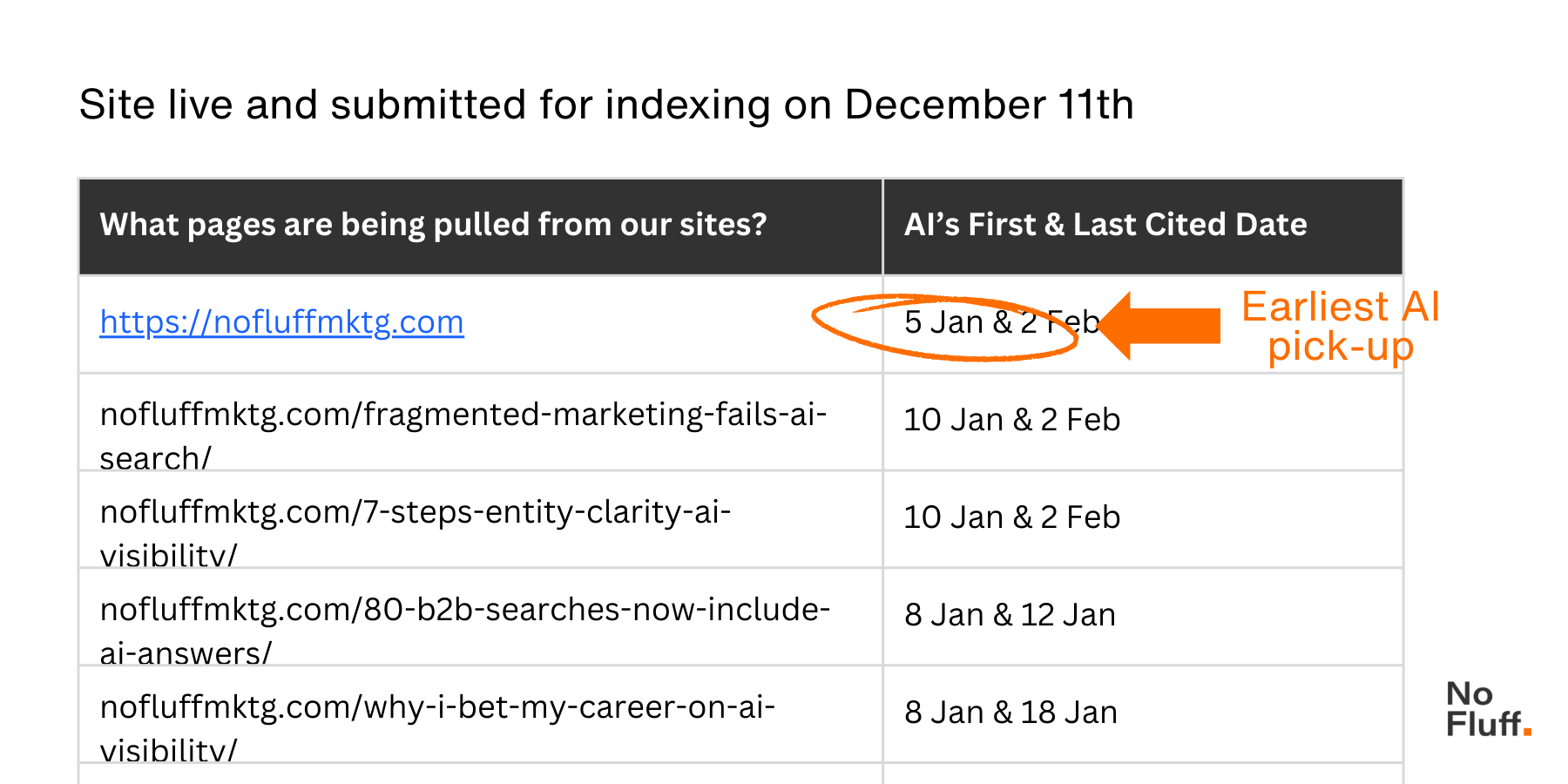 The first AI pickup from a new domain can happen within three to four weeks. In this experiment, the first page was discovered on day 27. After that initial discovery, subsequent pages were picked up faster, with the shortest lag around eight days.