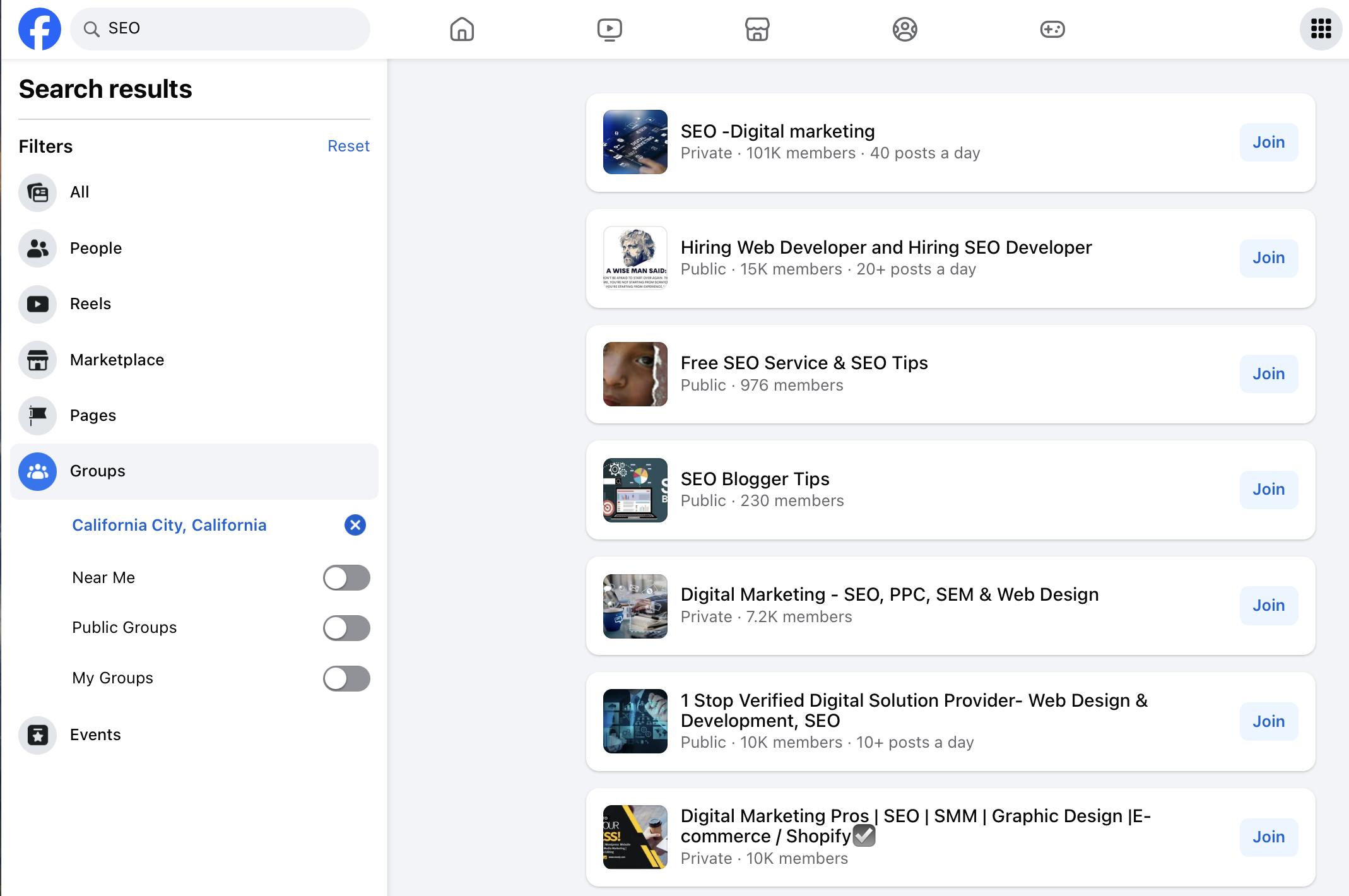 Facebook can serve as a great, less formal alternative to LinkedIn, particularly Facebook groups, which remain popular for professional networking. You can plug in related keywords for your interest or industry within Facebook, then click on Groups and filter the results according to your location.