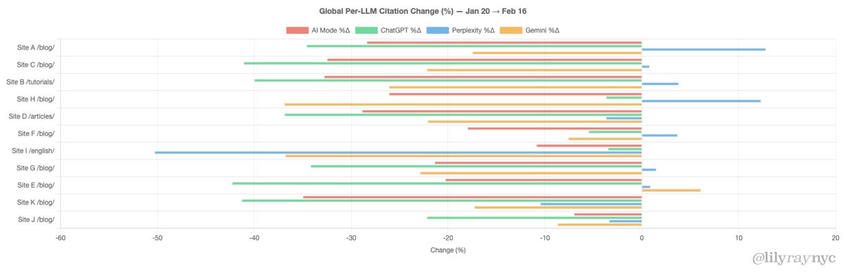 • While Gemini also saw broad declines (10 of 11 sites), Perplexity proved to be the most resilient, with only 4 of the 11 sites seeing a drop and a much milder average change of -2.9%.