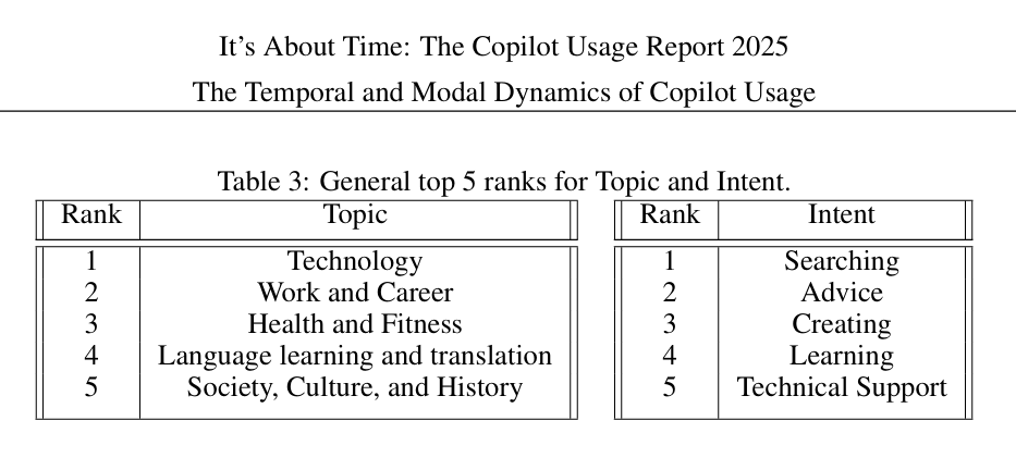 Top 5 topics and intents from the Microsoft Copilot usage study (Screenshot by author, January 2026)