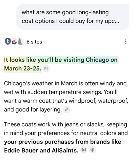 Stein offered examples in the announcement. A user searching for trip activities could receive recommendations based on hotel bookings in Gmail and past travel photos. Someone shopping for a coat could get suggestions that account for preferred brands, upcoming travel destinations from flight confirmations, and expected weather conditions.