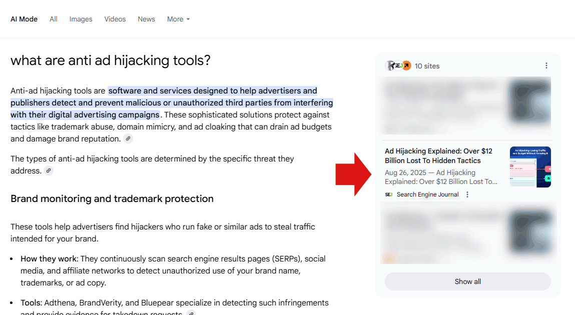Below is a screenshot of a sponsored post that’s indexed by Google and is ranking in AI Mode for the keyword phrase “what are ad hijacking tools.”