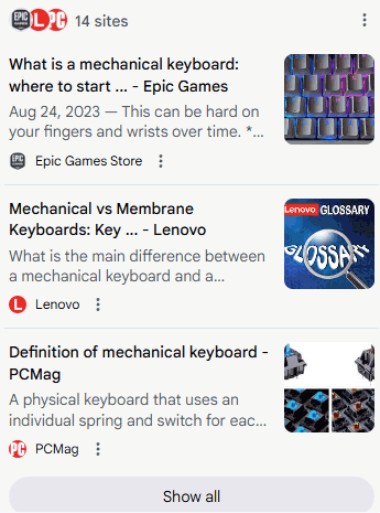 Here’s a screenshot of images that accompany the cited webpages for the query, “What is a mechanical keyboard?”