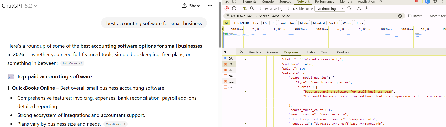 Search queries containing “best” tend to return recent results both in the search results and within LLM responses. For example, when a user is looking for the “best accounting software for small business,” Google often prominently ranks articles that were published or updated within the last year, and ChatGPT also generates fan-out queries containing “2026” to ensure the user’s query pulls up recent information: