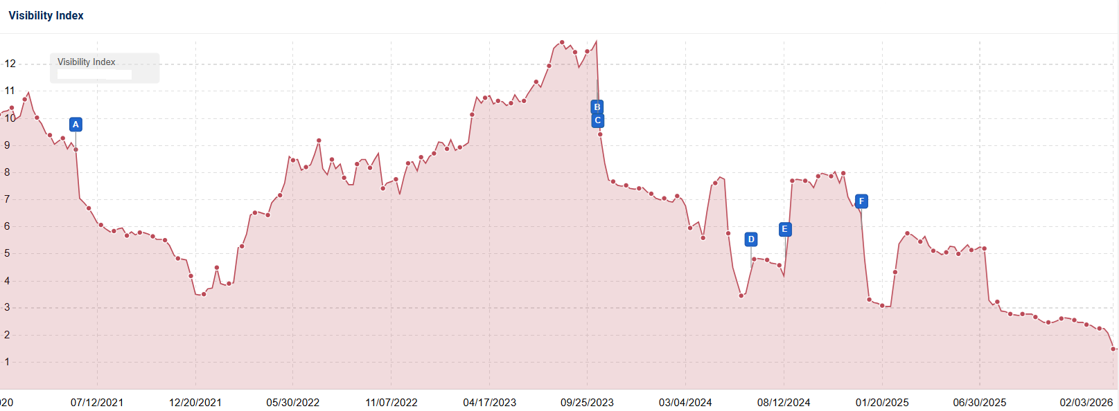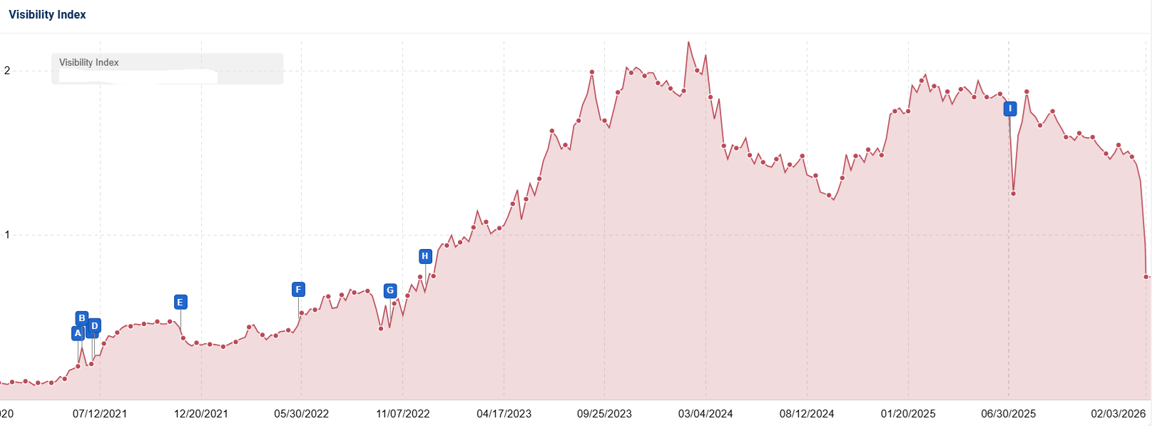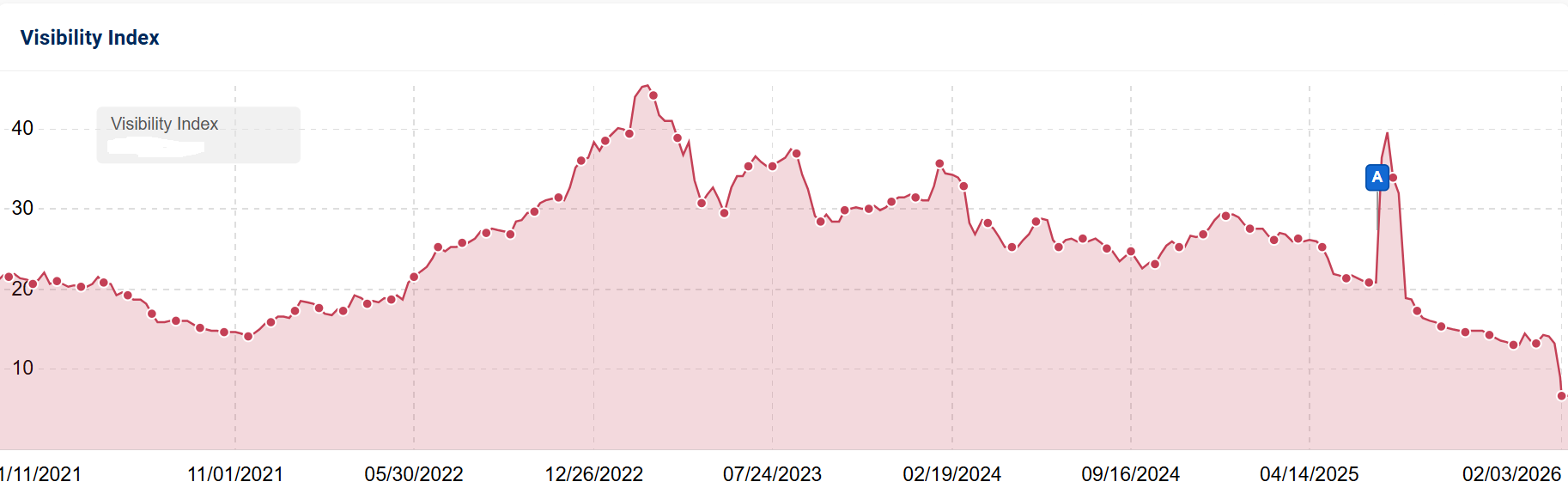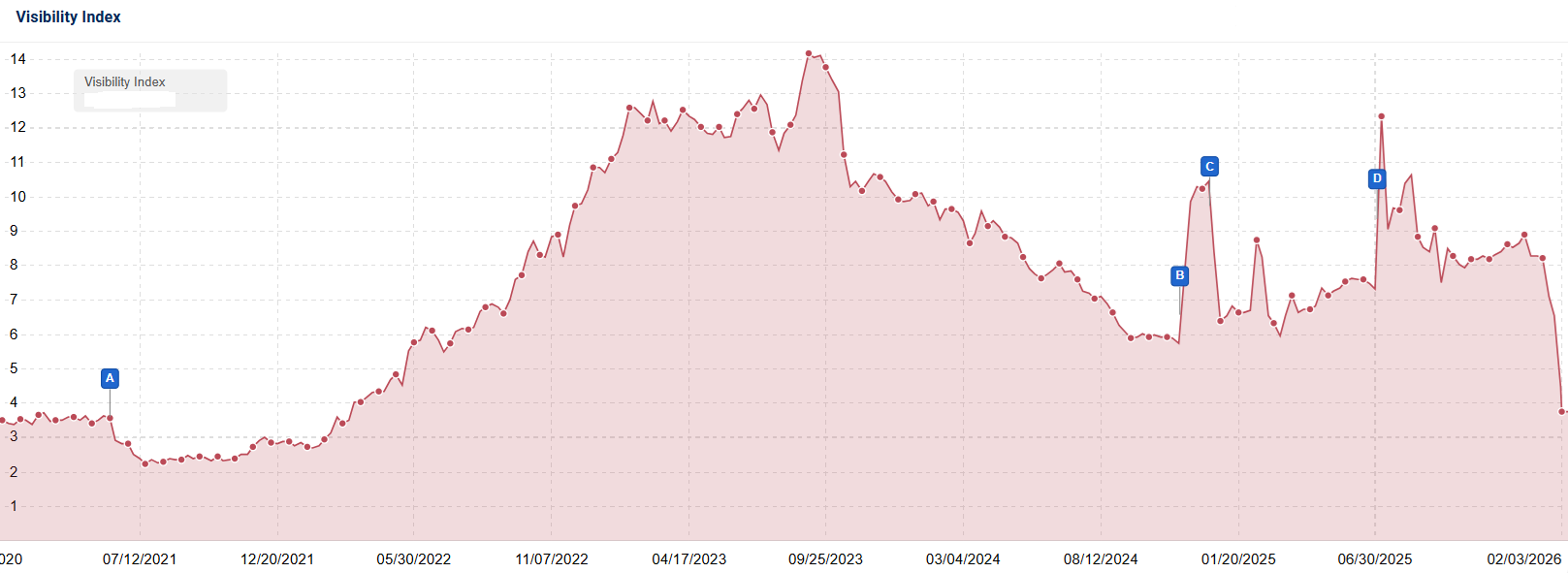 The visibility chart below shows an example of a well-known $8B B2B brand that saw its organic visibility drop by a whopping -49% between January 21 and February 2, 2026.