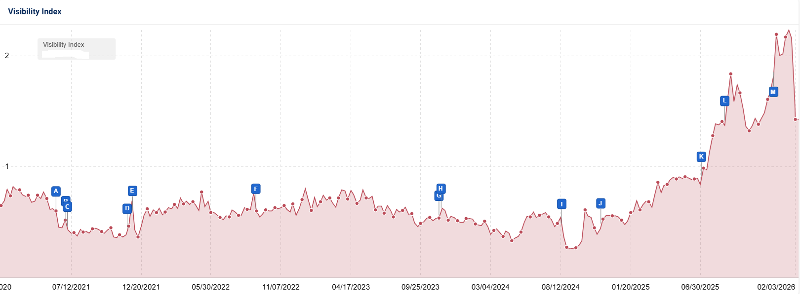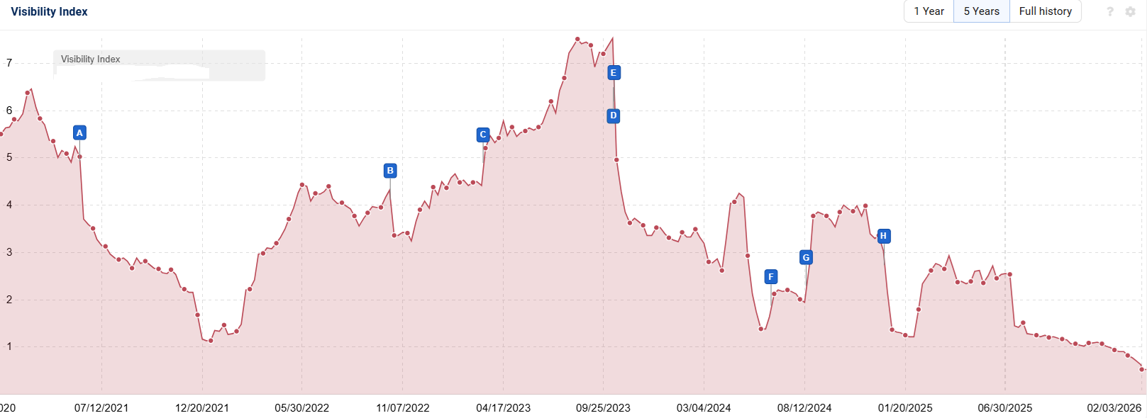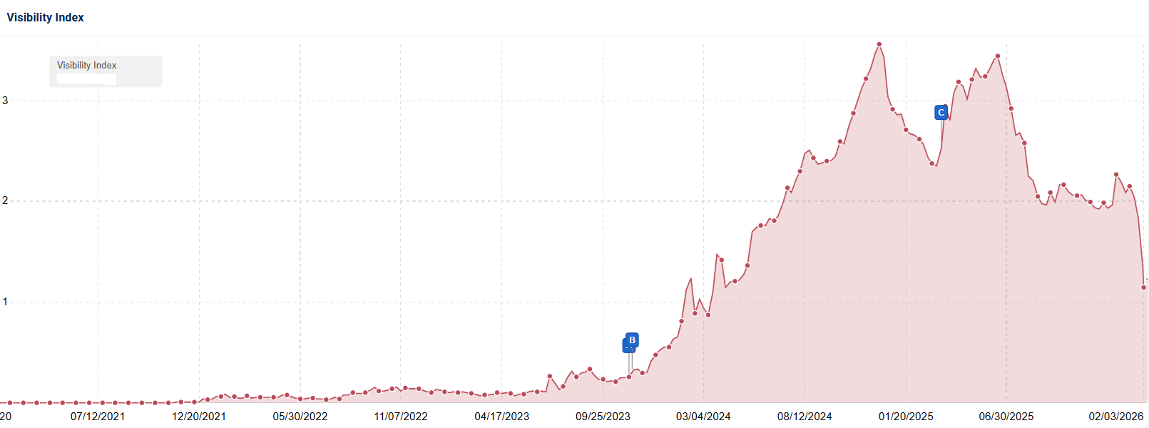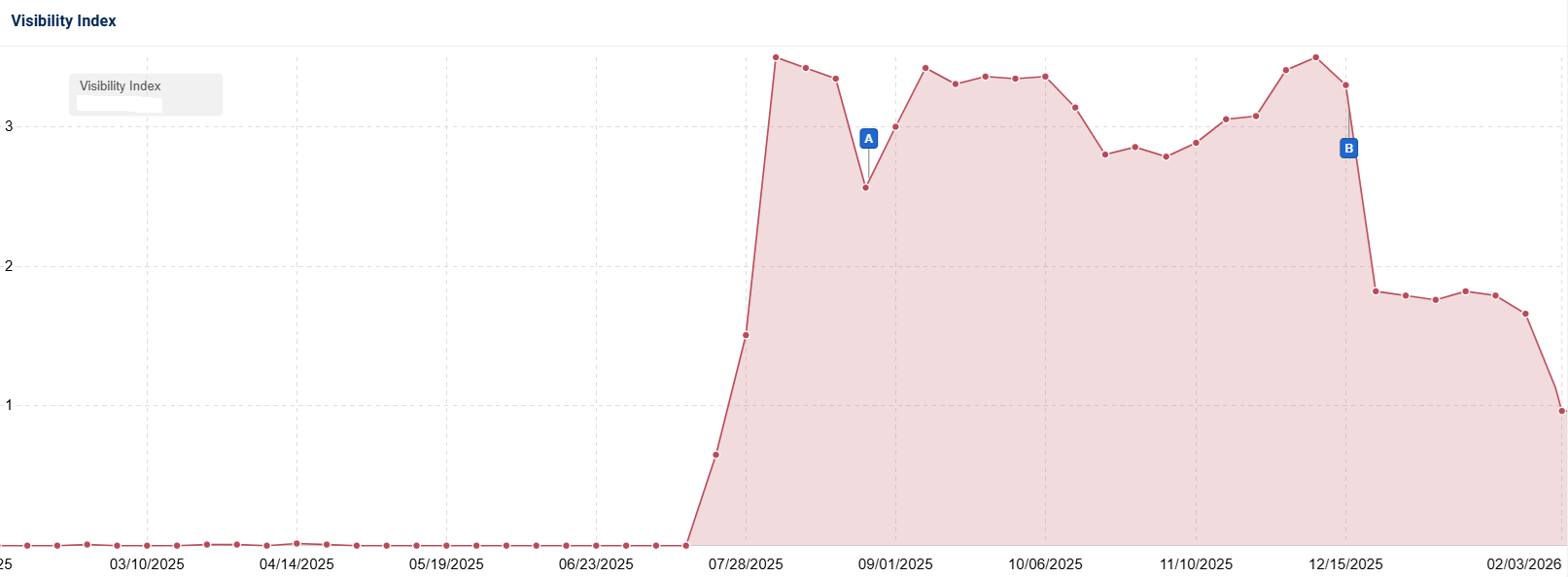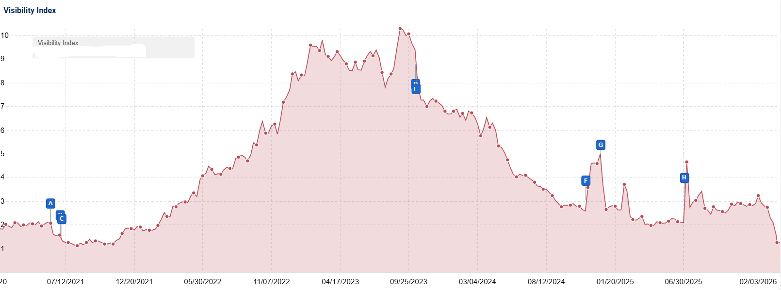 The visibility chart below shows an example of a well-known $8B B2B brand that saw its organic visibility drop by a whopping -49% between January 21 and February 2, 2026.