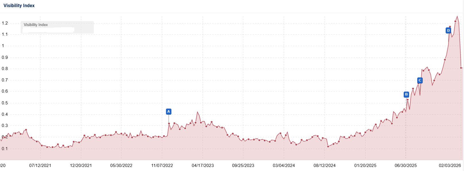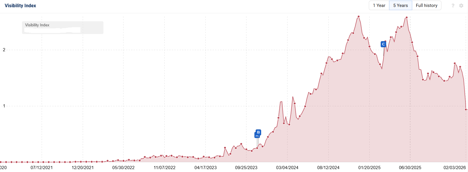 The next site is a software company that appears to have launched its company blog around July of 2025. The blog represents about 93% of the site’s overall SEO visibility. Below is a view of the full site’s visibility trajectory: