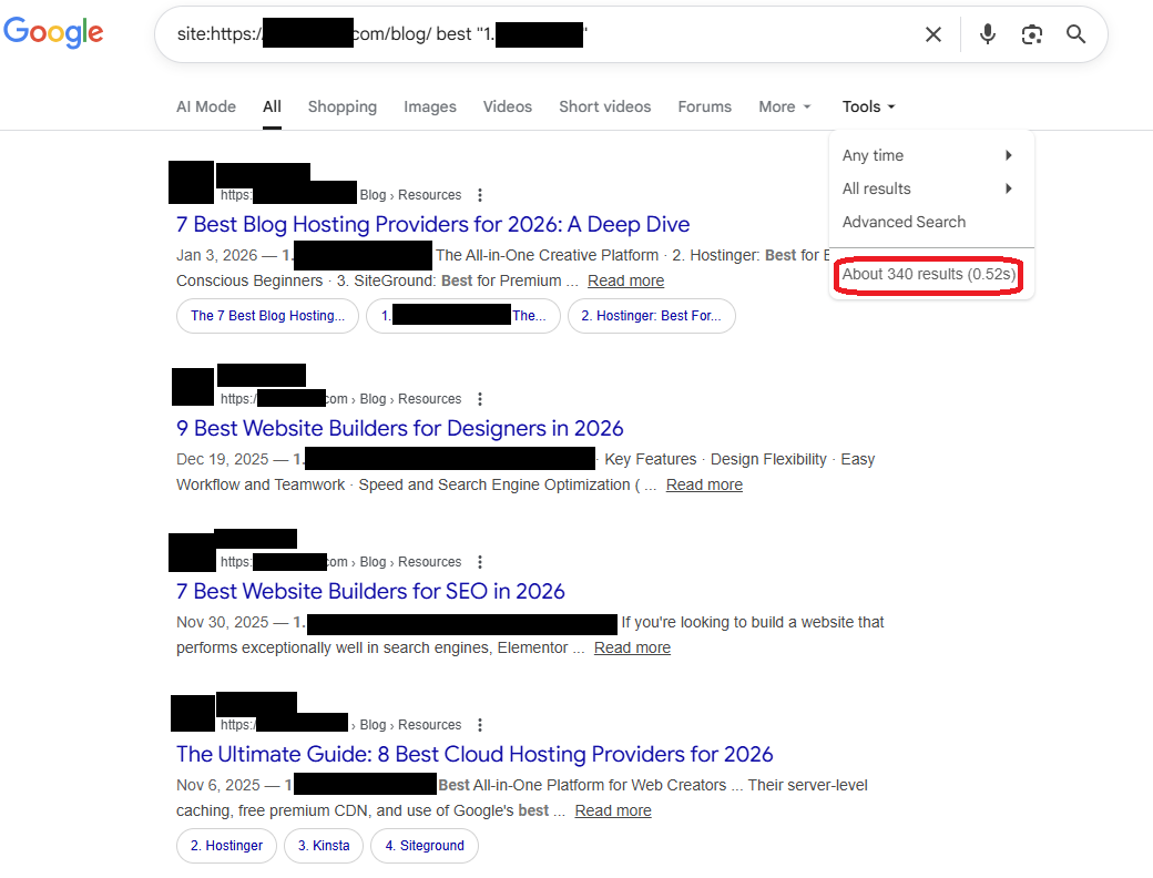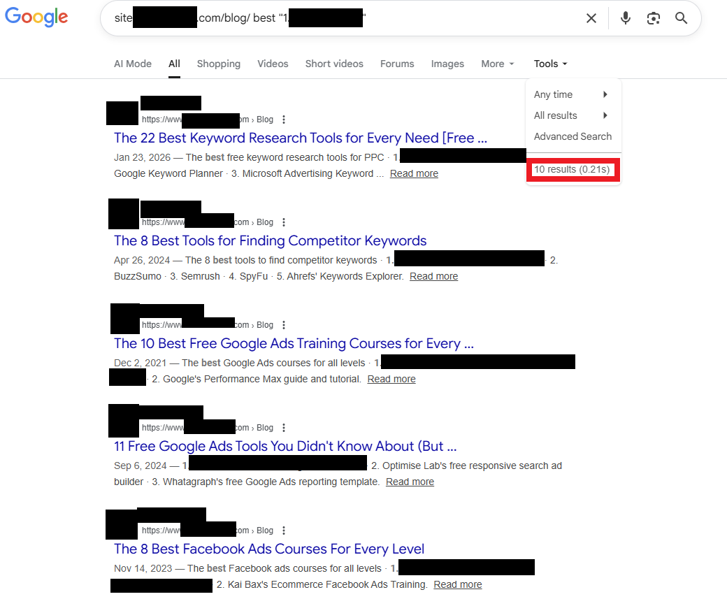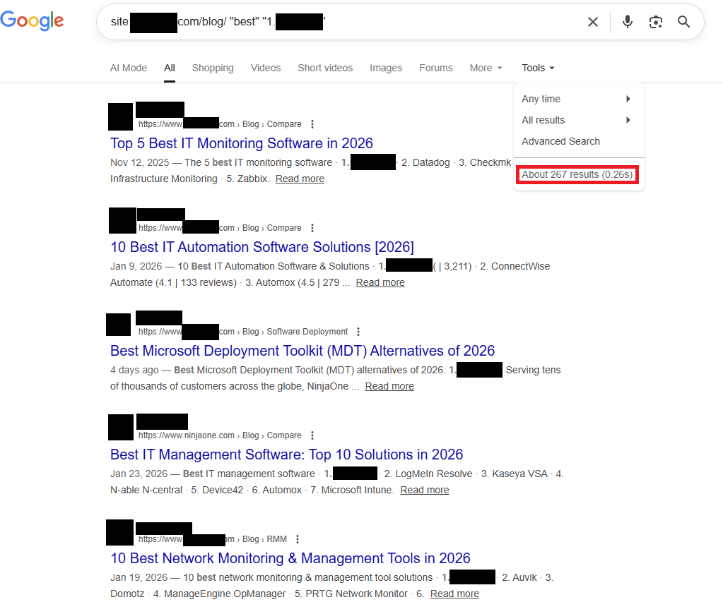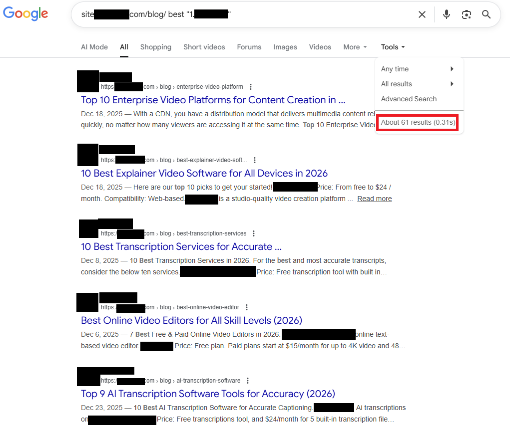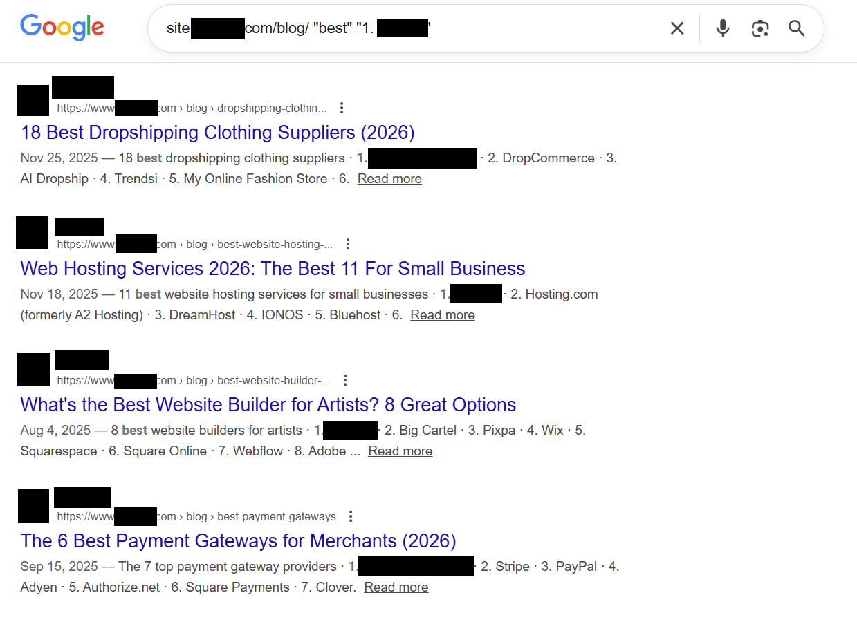 But something else stood out: the blog contained dozens of self-promotional listicles. 191 of them, to be precise. By self-promoting listicles, I mean an article containing “best” where the company lists itself as the No. 1 best. You can easily detect this with the following search on Google (replace with your site’s details):