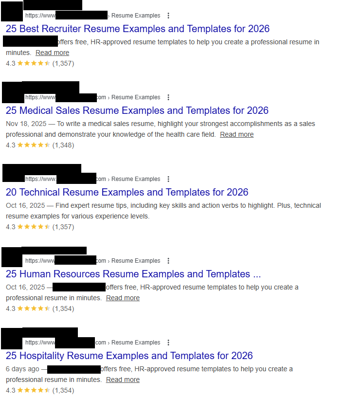 • The blogs were using other tactics I have seen get sites in trouble with during Google’s algorithm updates: artificial refreshining (including recent dates when the article was not substantially updated); Schema.org violations, such as misusing AggregateRating Schema across ineligible pages; excessive informational/definition-based content, content that is overly salesy and/or strays from the main purpose of the site, and heavy automation/programmatic templates scaled across hundreds or thousands of pages