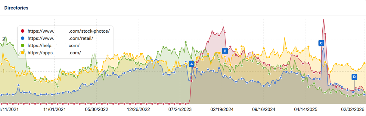 Other subfolders and subdomains on the site showed much smaller declines, or even visibility gains, during the same time period: