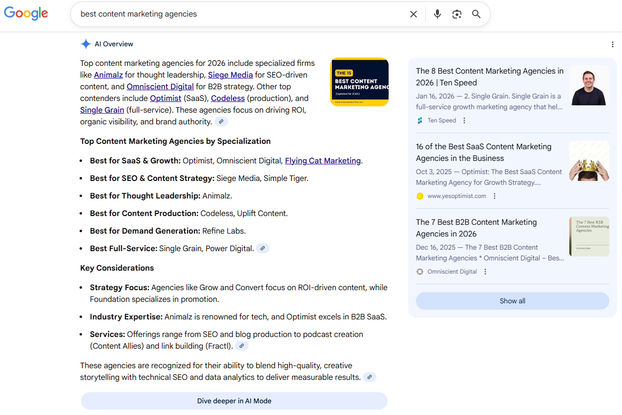 When you dig into the listed sources, you’ll notice that the recommended companies are using listicle-style blogs to rank themselves as the No. 1 top content marketing agency (example articles from OmniscientTen Speed, and Optimist are shown as sources above).