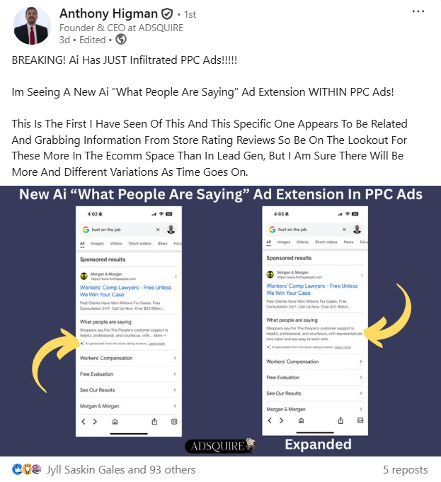 A new automated asset gained attention this week when Anthony Higman shared a screenshot showing Google testing a “What People Are Saying” asset.