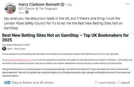 If you engage even a little bit with a black hat community, you’ll know how easy it is right now to leverage expired domains. In the example below, someone had bought the London Road Safety website (a once highly authoritative domain) and turned it into a single-page “best betting sites not on GamStop” site.